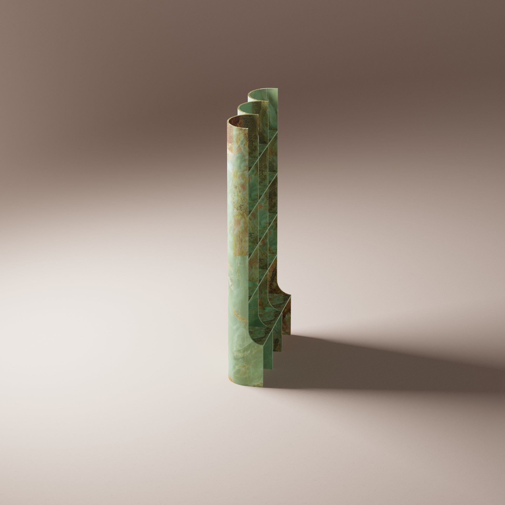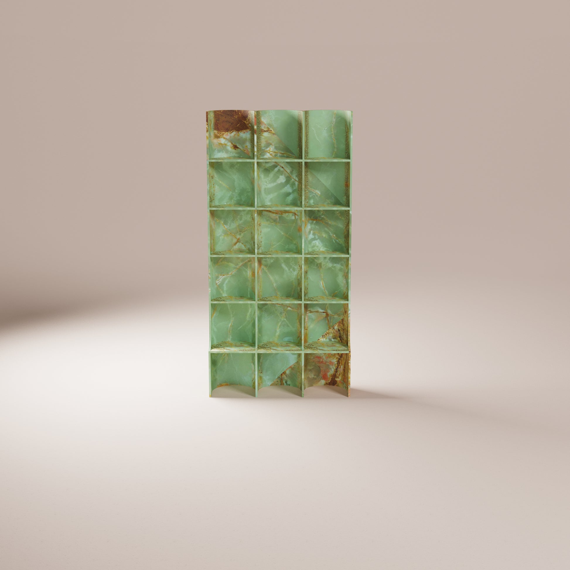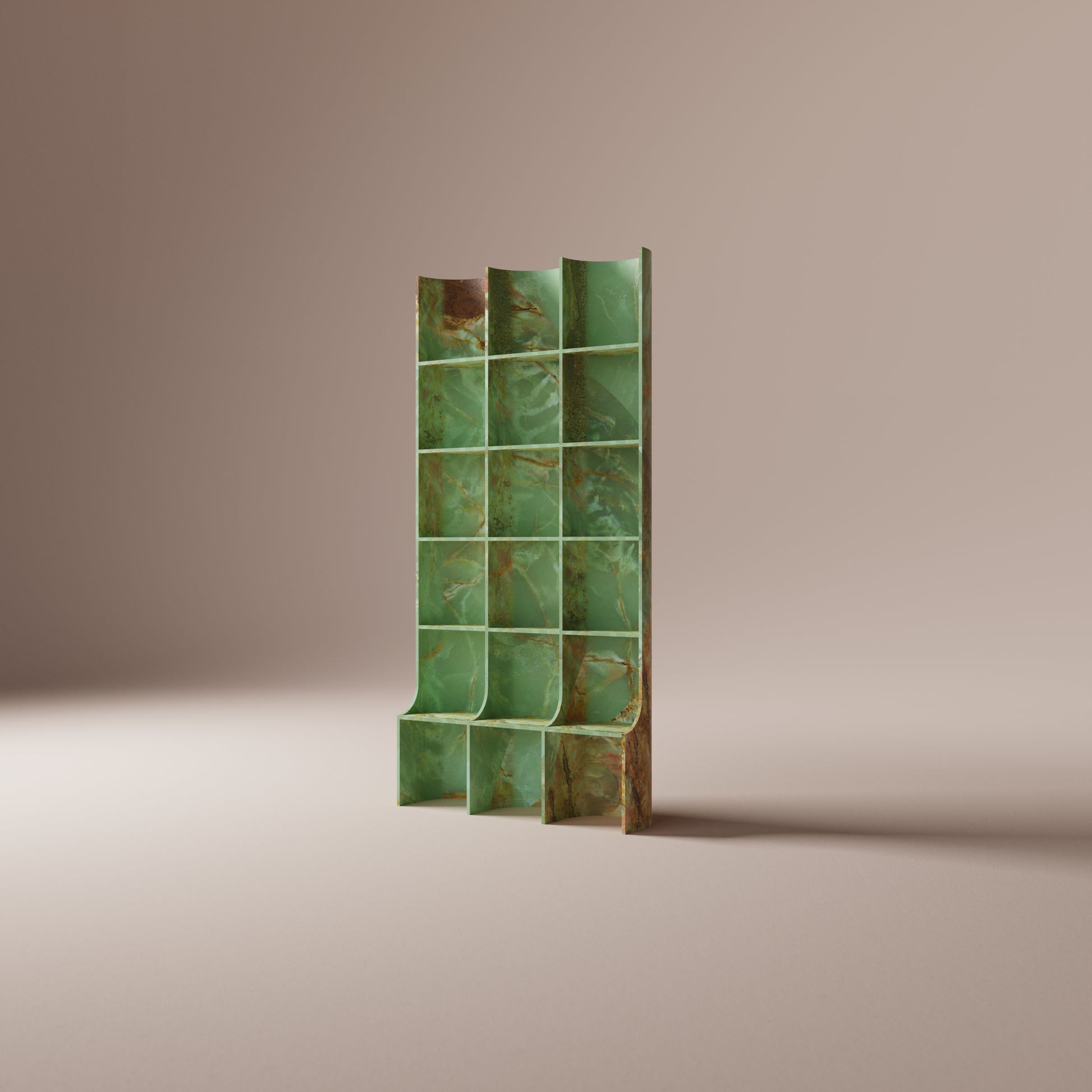 Translucent slabs of vibrant green onyx form a mesmerizing tapestry across the shelves. The undulating curves, a testament to meticulous craftsmanship, infusing any space with a sense of tranquility.